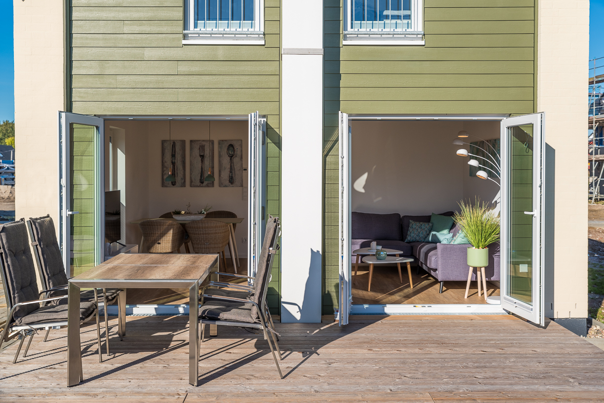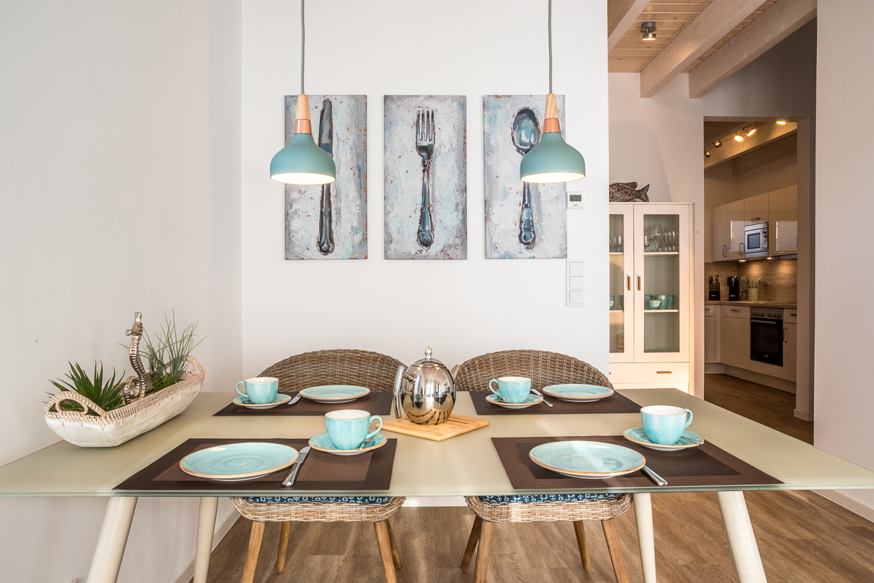 Ob Frühstück, Mittag- oder Abendessen – der lichtdurchflutete Raum lädt zum Verweilen ein. Durch die großen, bodentiefen Fenster blickt ihr über die große Terrasse auf die zum Haus gehörende Grünflache, die ihr zum Spielen und Ausruhen nutzen könnt.