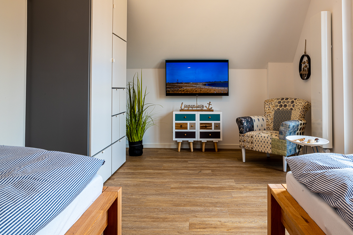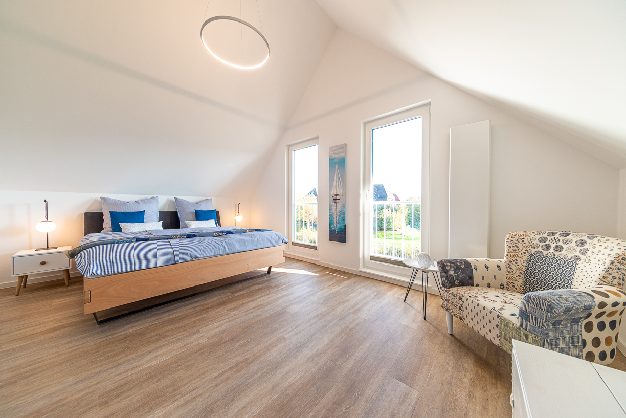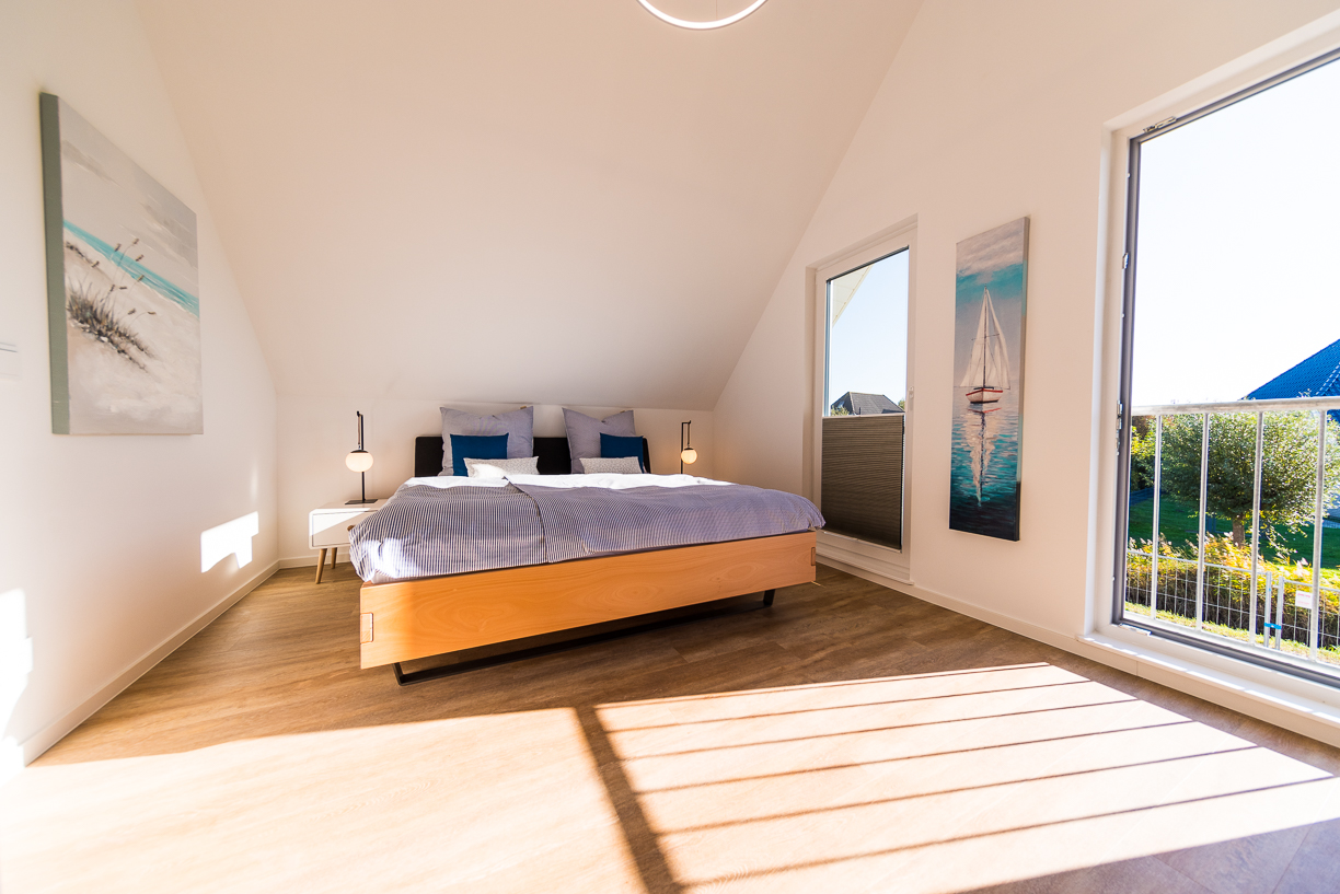 Auf der anderen Seite im Obergeschoss liegt das Schlafzimmer mit zwei einzelnen Betten. Auch hier können die bodentiefen Fenster mit Plissees verdunkelt werden.