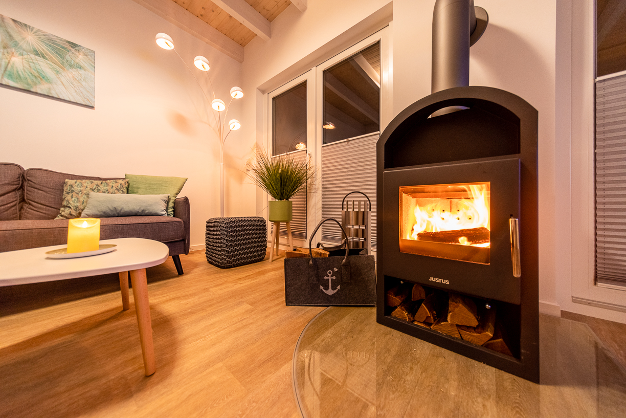 An kühlen Tagen verbreitet das knisternde Holz im Kaminofen eine wohlige Wärme. Durch die Glastür blickt ihr auf die Flammen im Inneren des Kamins.