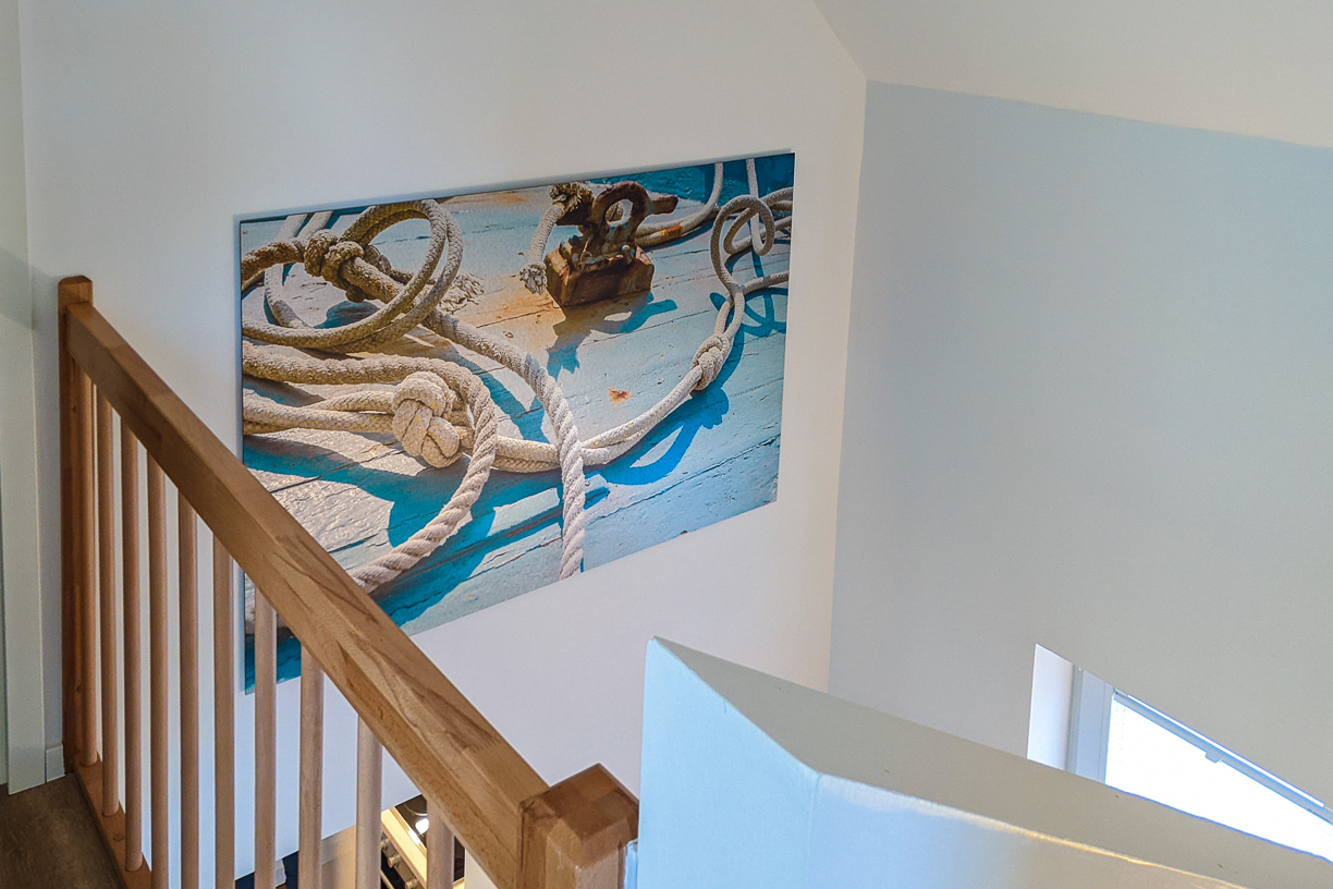 Auf dem Weg nach oben in die Schlafzimmer lohnt sich der Blick zurück auf das große, modern maritime, Bild.