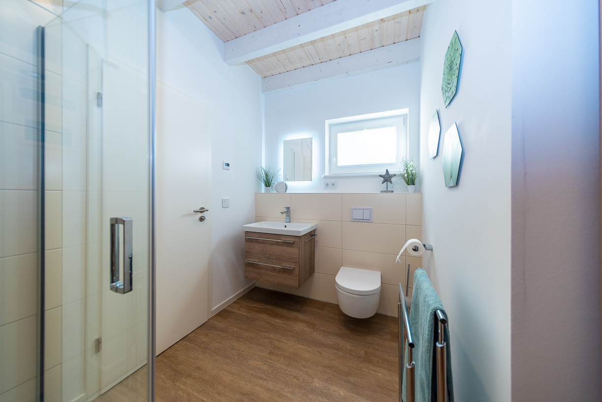 Im Erdgeschoss, gleich neben der Eingangstür, liegt das Duschbad.