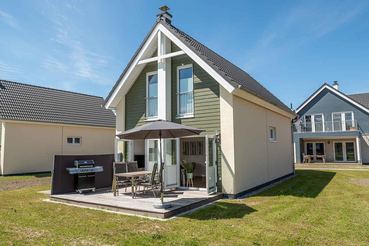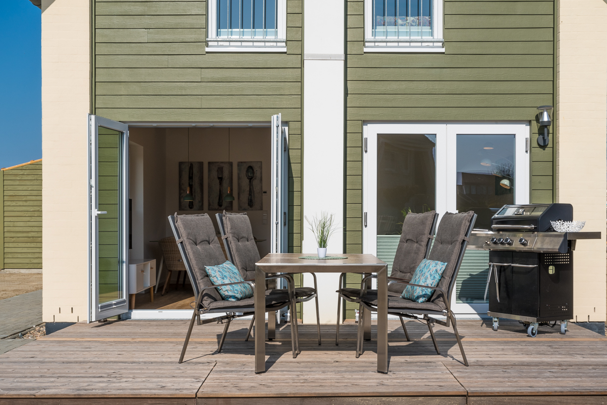 Durch die beiden großen Türen gelangt ihr aus dem Wohn-/Esszimmer auf die nach Süden ausgerichtete Terrasse. Vier Edelstahlstühle mit Relaxfunktion laden zum Verweilen am Tisch ein. Genießt die Sonne mit Blick auf das "alte" Büsum.