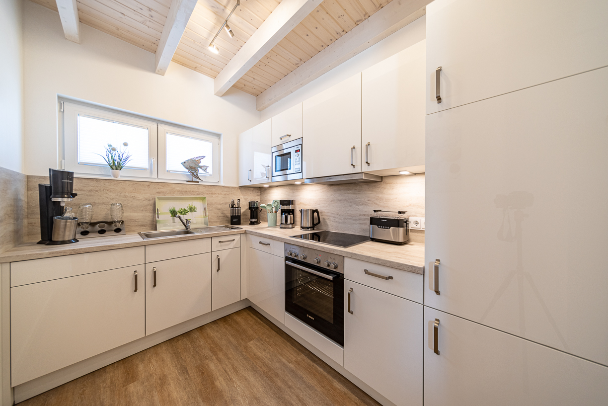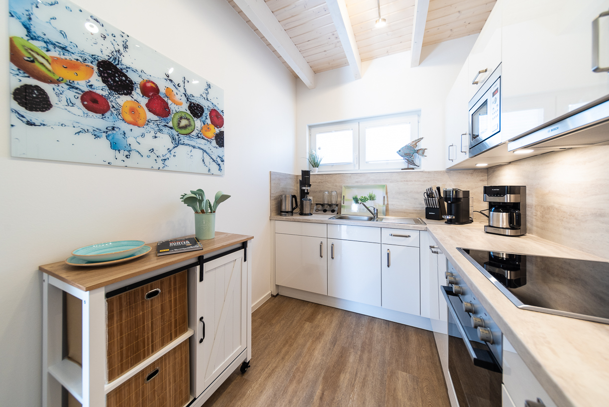 In der umfangreich ausgestatteten Küche findet ihr neben Filterkaffee-Maschine mit Edelstahl-Isolierkanne und Wasserkocher auch einen Toaster sowie eine Mikrowelle.
