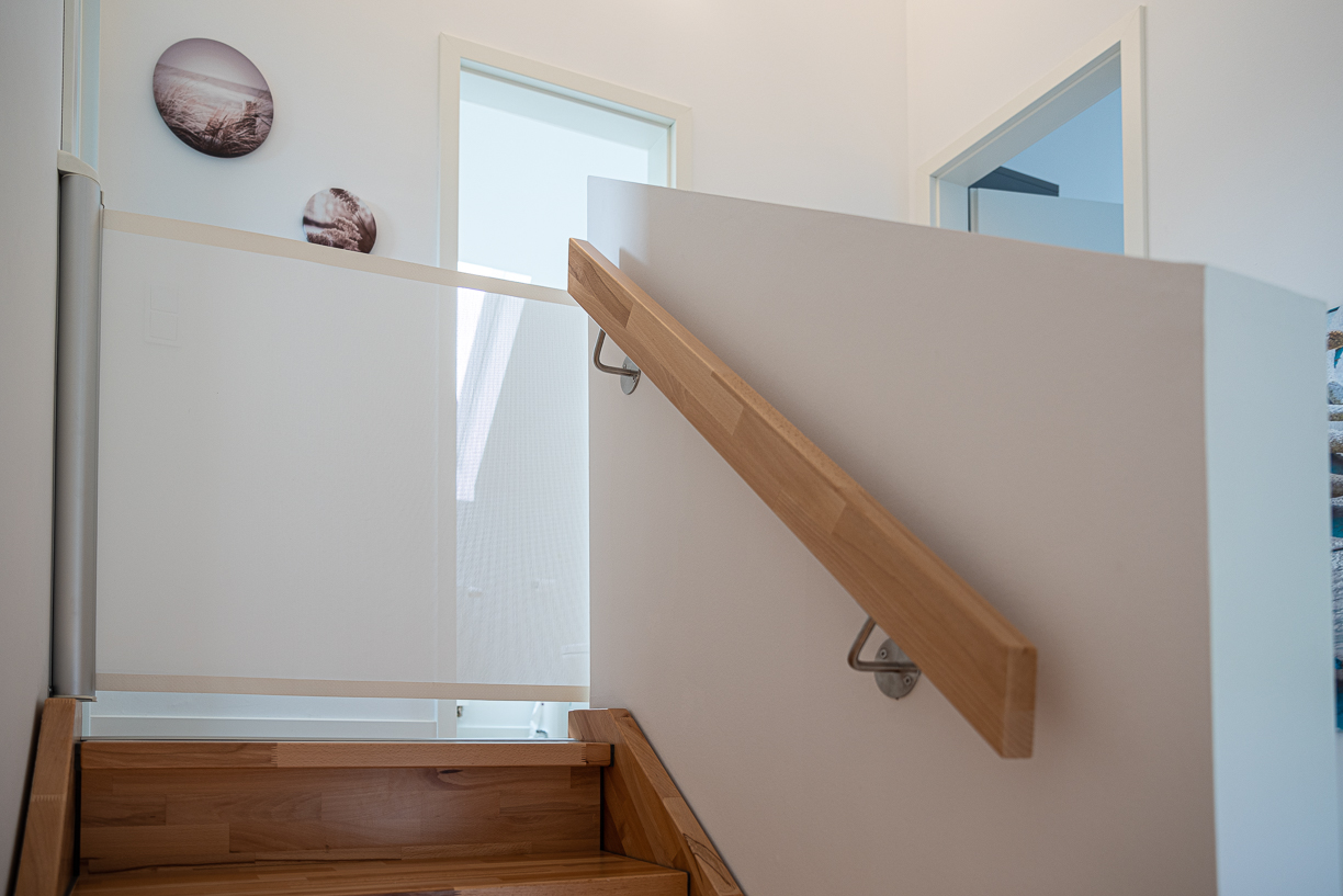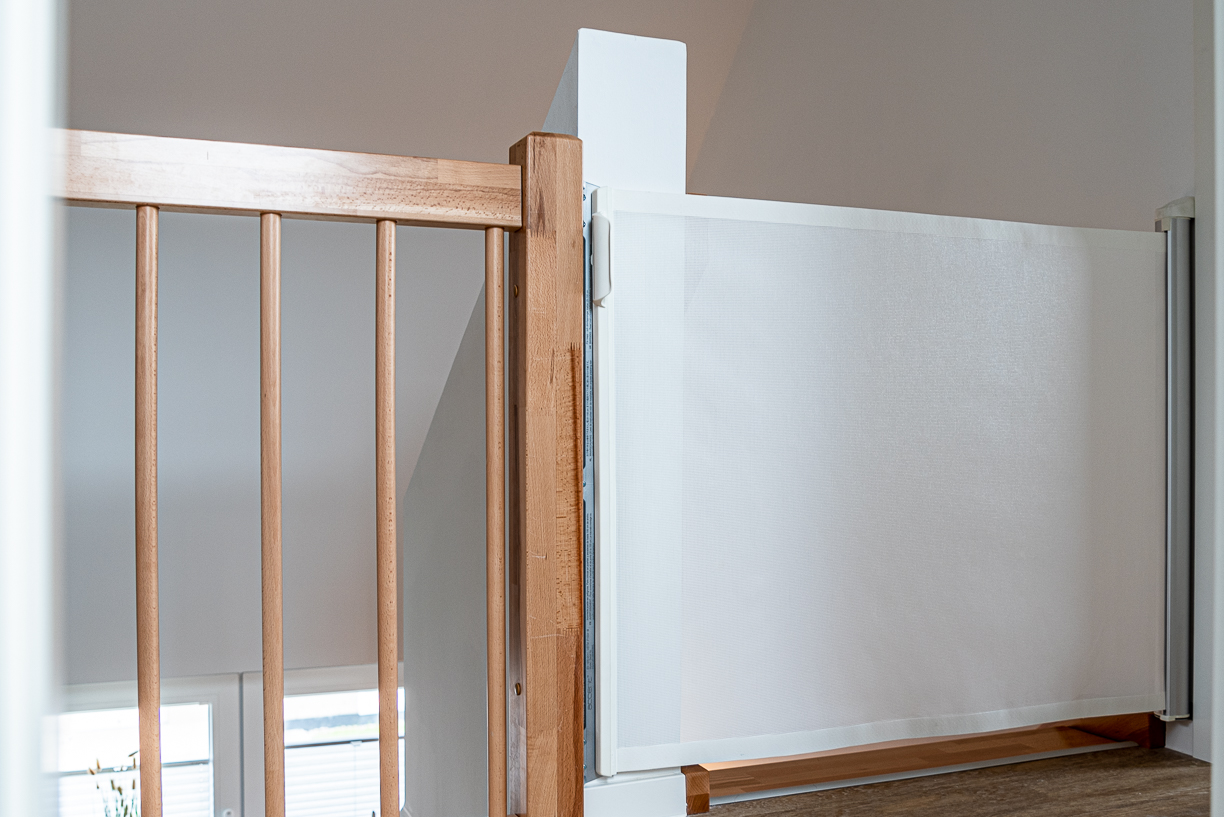 Damit ihr Nachts ruhiger schlaft könnt ihr das Treppenhaus oben mit einem ausziehbaren Treppenschutz sichern. Herumlaufende Kinder können dadurch nicht den Weg nach unten nehmen.
