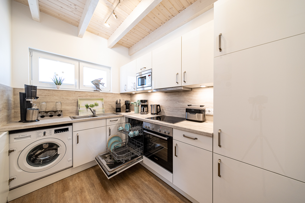 Um den Abwasch müsst ihr euch nicht kümmern, diesen erledigt der verdeckt eingebaute Geschirrspüler für euch. Auch die Waschmaschine arbeit auf Wunsch verdeckt für euch.